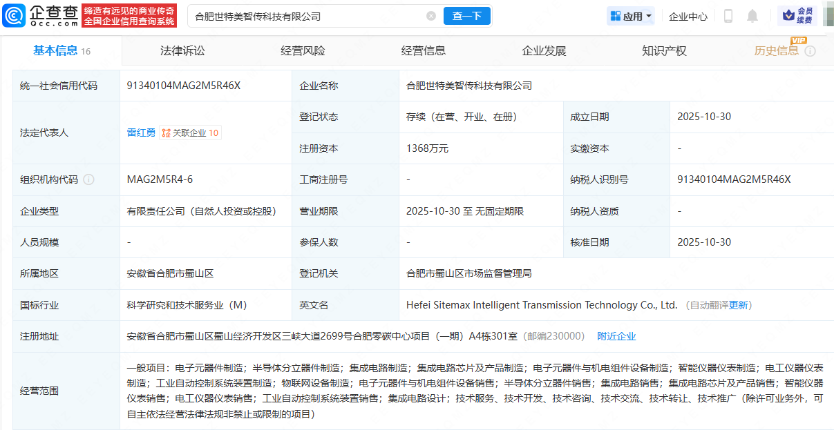 近日,合肥世特美智传科技有限公司成立,法定代表人为雷红勇,注册资本为1368万元,经营范围包含:电子元器件制造;半导体分立器件制造;集成电路制造;集成电路芯片及产品制造;集成电路销售等。企查查股权穿透显示,该公司由雷红勇、阳光电源(300274)全资子公司合肥阳光零碳技术有限公司等共同持股。